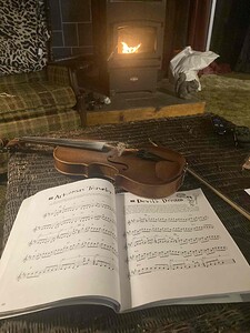 A wonderful night playing fiddle songs on my favorite violin in front of my wood stove. Life is great!!